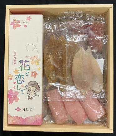 - 司牡丹 純米吟醸酒(花と恋して)720ml:1本、沖うるめ塩干:5尾、鰹はらんぼ塩干:4枚、ふか(さめ)塩干:3切、ふぐみりん干:3枚、ふぐ一日干・塩:2枚、さばみりん干:2枚、しいらみりん干:3切