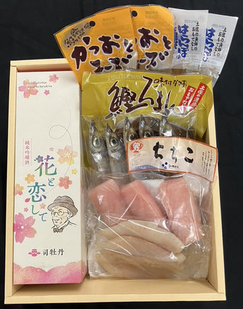 - 司牡丹 純米吟醸酒『花と恋して』720ml:1本、フグ一日干塩干(3枚)、ふか(さめ)塩干:3切、沖うるめ塩干:5尾、鰹ちちこ煮:1袋、鰹ろまん:1袋、かつおとチーズ:2袋、まるかじりハランボ:2袋