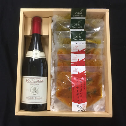 ベリー系の香り豊かで果実味に溢れた味わい『ブルゴーニュ・ピノ・ノワール』とワインと相性のいいオイルサーディンのセット。誕生日祝いや記念日等にお勧め♪